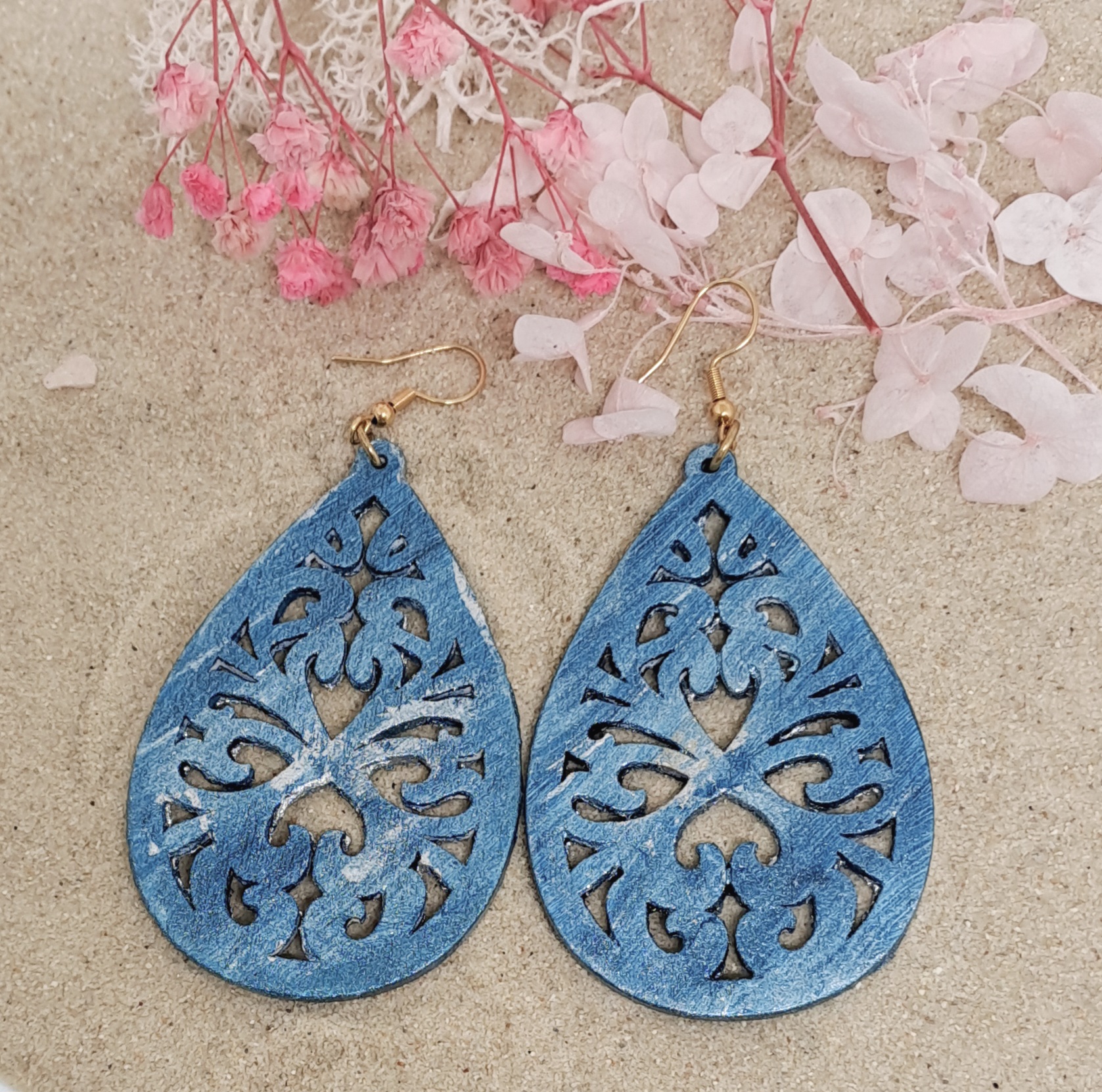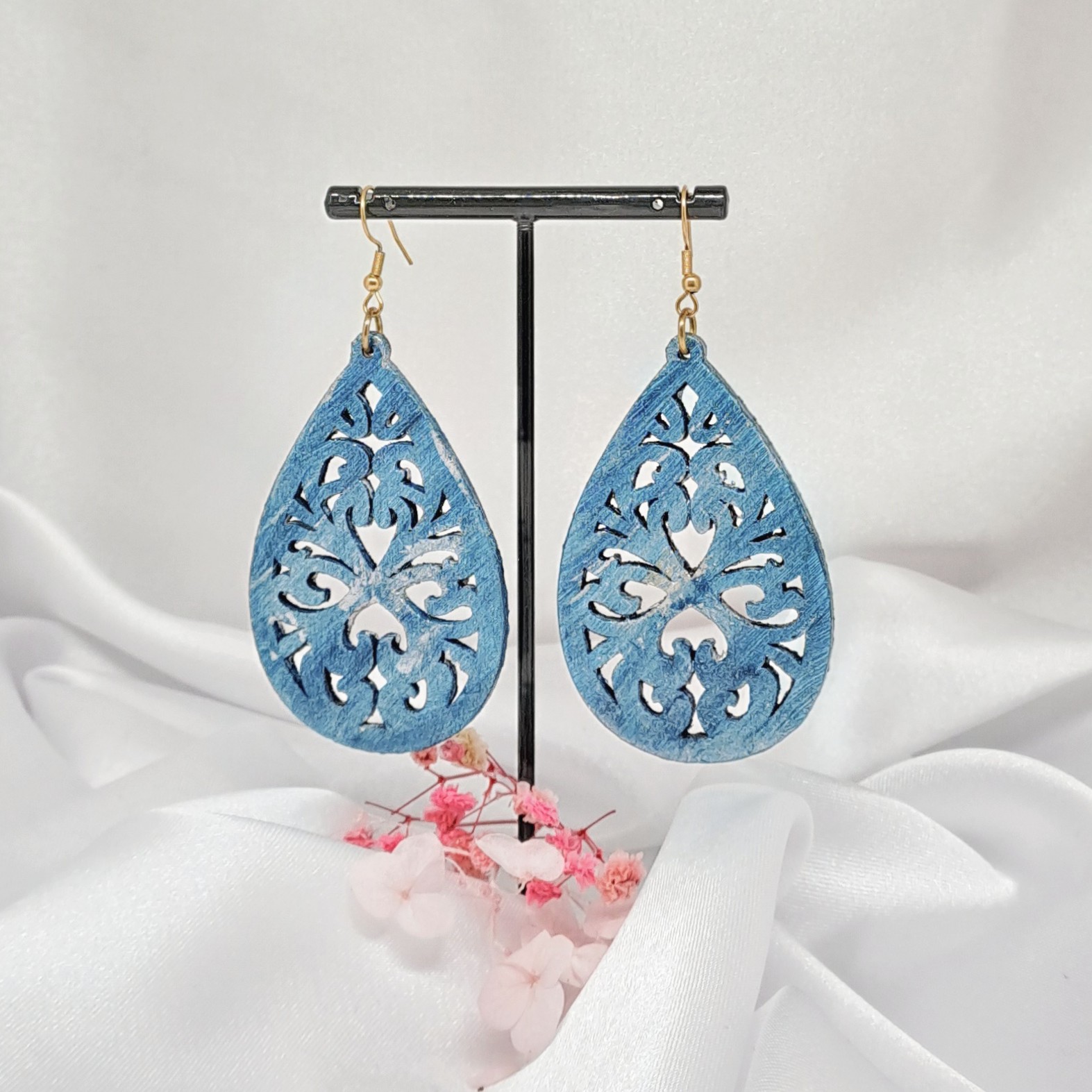 Boucles d’oreilles en bois peintes à la main et vernies.